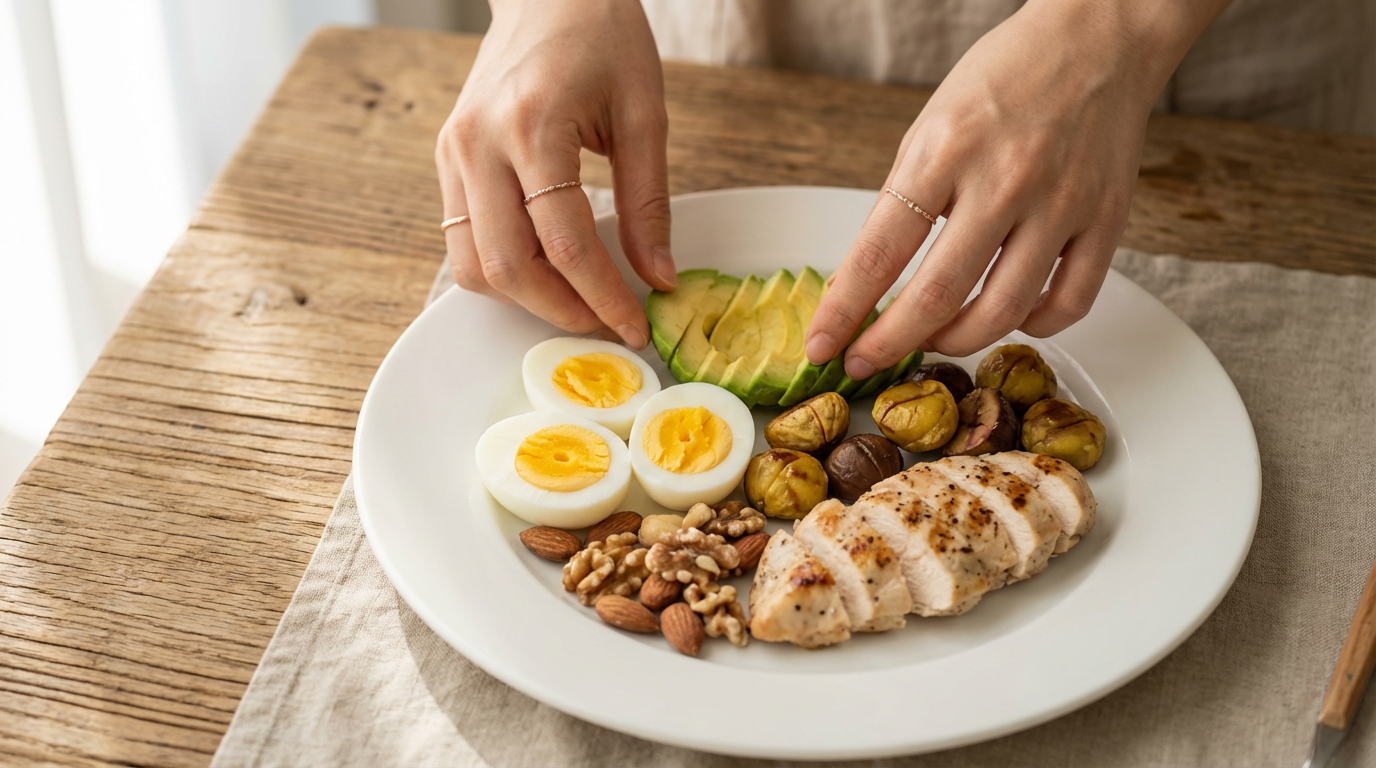 메뉴는 삶은 달걀, 닭가슴살, 아보카도, 견과류, 그리고 밤호박 에그슬럿 같은 영양가 높은 음식들로 구성했습니다.