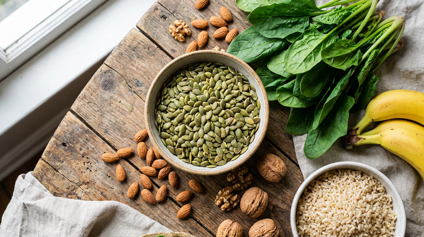 마그네슘이 풍부한 음식으로는 시금치, 호박씨, 아몬드, 다크 초콜릿, 바나나, 현미 등이 있으니 식단에도 신경 써보세요.